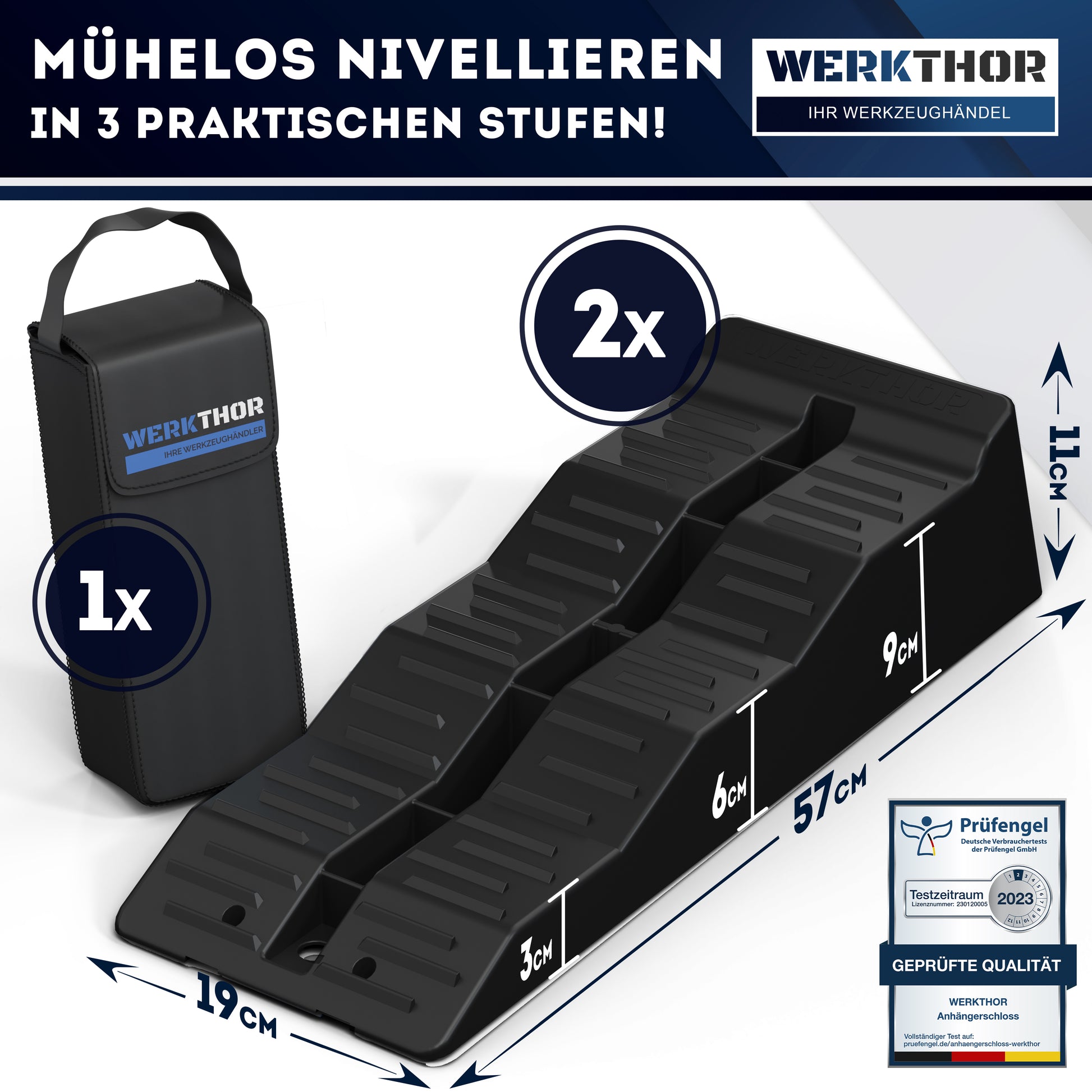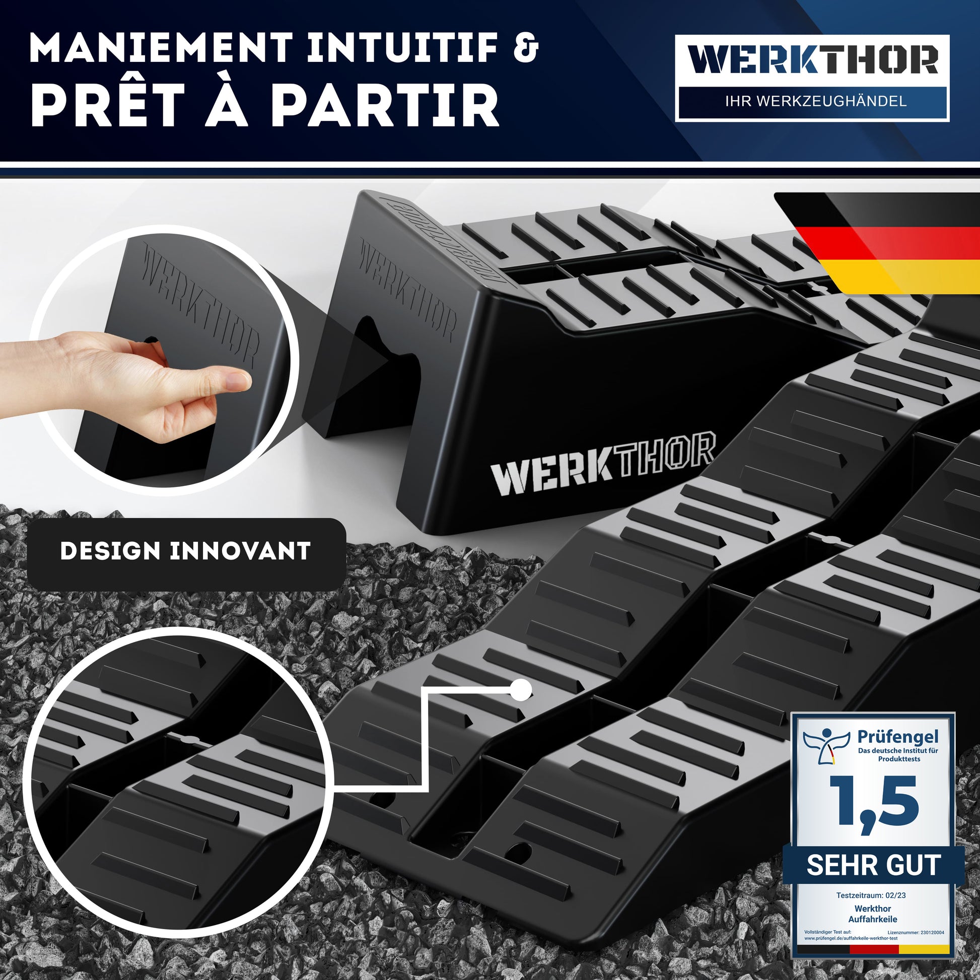 Avec une hauteur allant jusqu'à 12 cm et trois niveaux de réglage, les rampes WERKTHOR sont polyvalentes et faciles à utiliser. Ces dimensions permettent une mise à niveau sûre et pratique de votre véhicule, notamment sur les surfaces irrégulières.