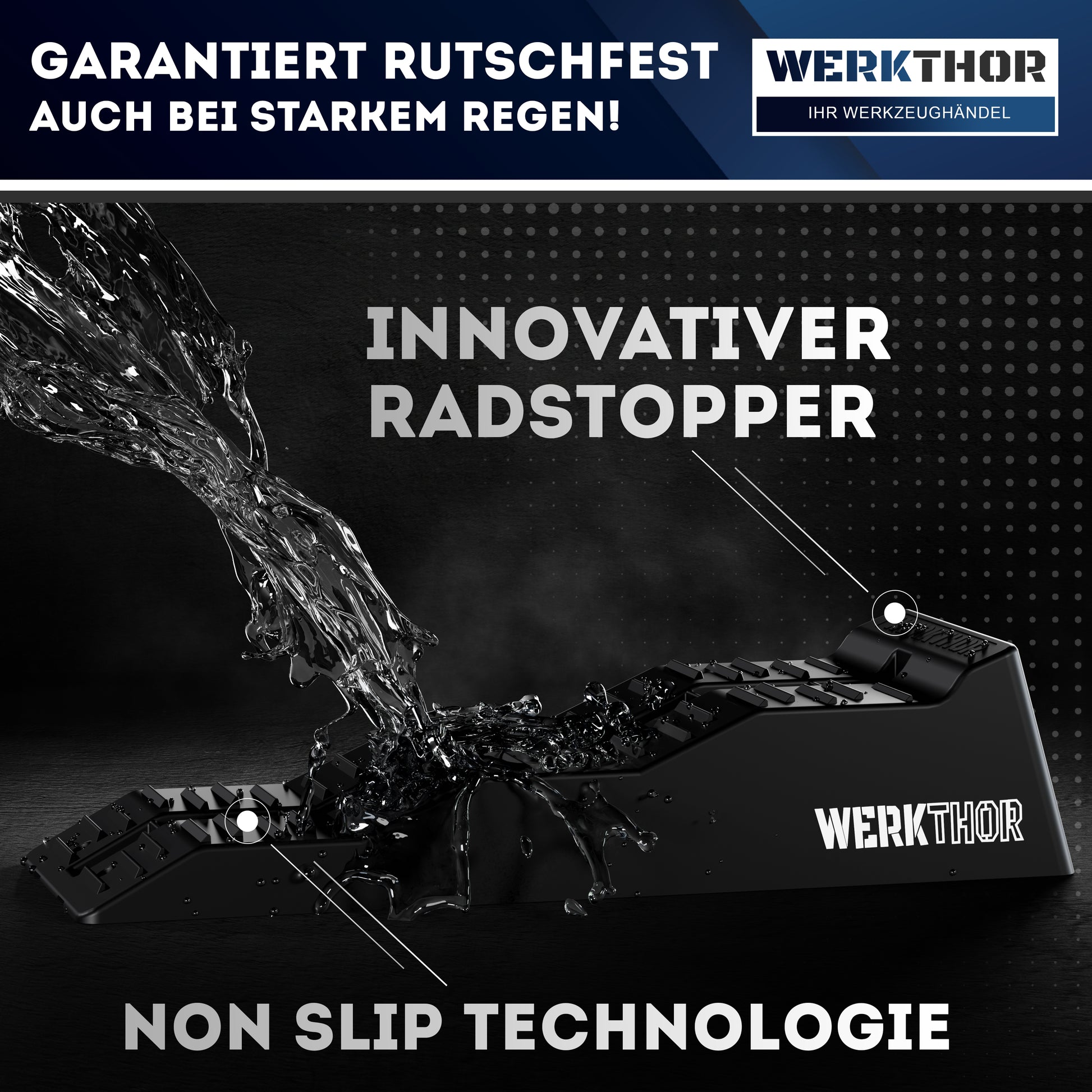 Avec les cales de rampe WERKTHOR, l'accès à la route est un jeu d'enfant : placez les cales devant les roues et avancez lentement et prudemment jusqu'à atteindre la hauteur souhaitée. Grâce à la large surface antidérapante, votre véhicule s'arrêtera en toute sécurité. Vous pouvez également le sécuriser avec le frein à main et les cales de roue.