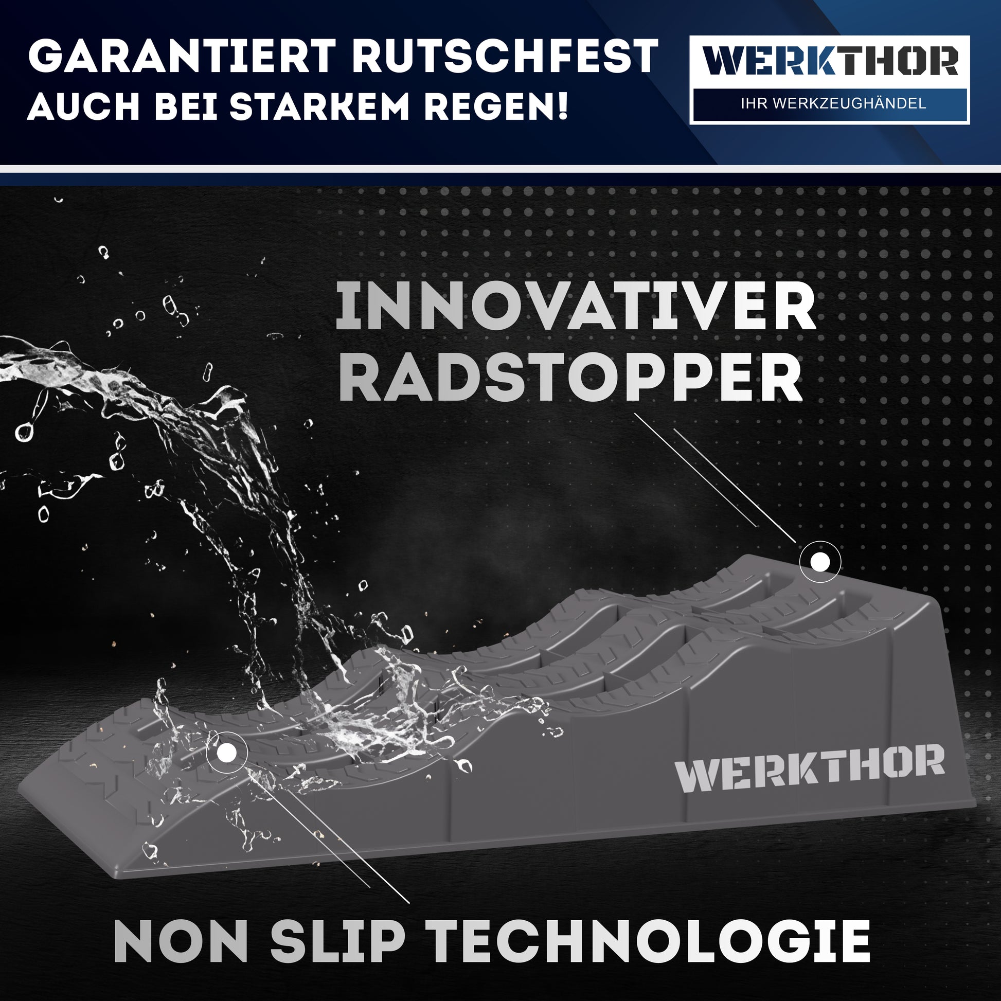 • MAINTIEN 100 % SÛR – Les cales de rampe WERKTHOR permettent un nivellement rapide et facile [jusqu'à 10 cm]. Résistantes aux intempéries et adaptées à tous les types de surfaces, qu'il s'agisse de gravier, d'herbe ou de sable !