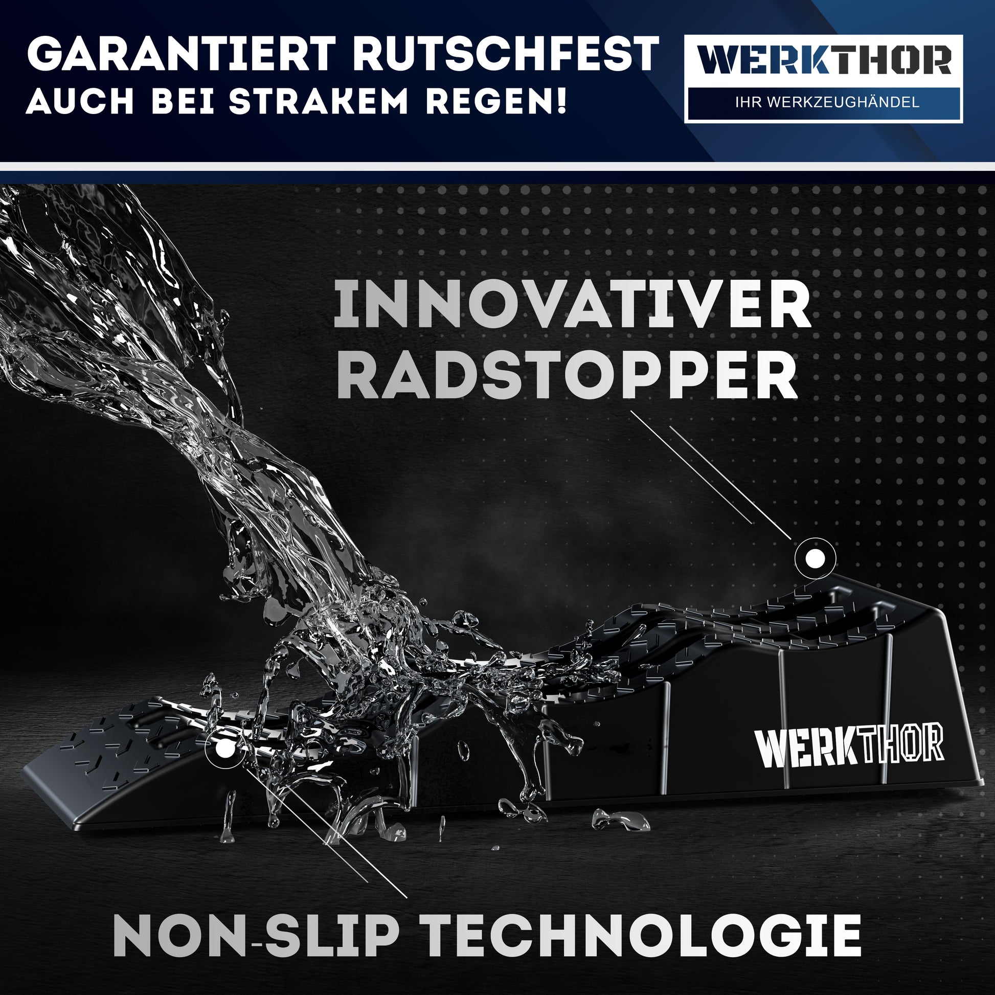 Avec les cales de rampe WERKTHOR, l'accès à la route est un jeu d'enfant : placez les cales devant les roues et avancez lentement et prudemment jusqu'à atteindre la hauteur souhaitée. Grâce à la large surface antidérapante, votre véhicule s'arrêtera en toute sécurité. Vous pouvez également le sécuriser avec le frein à main et les cales de roue.