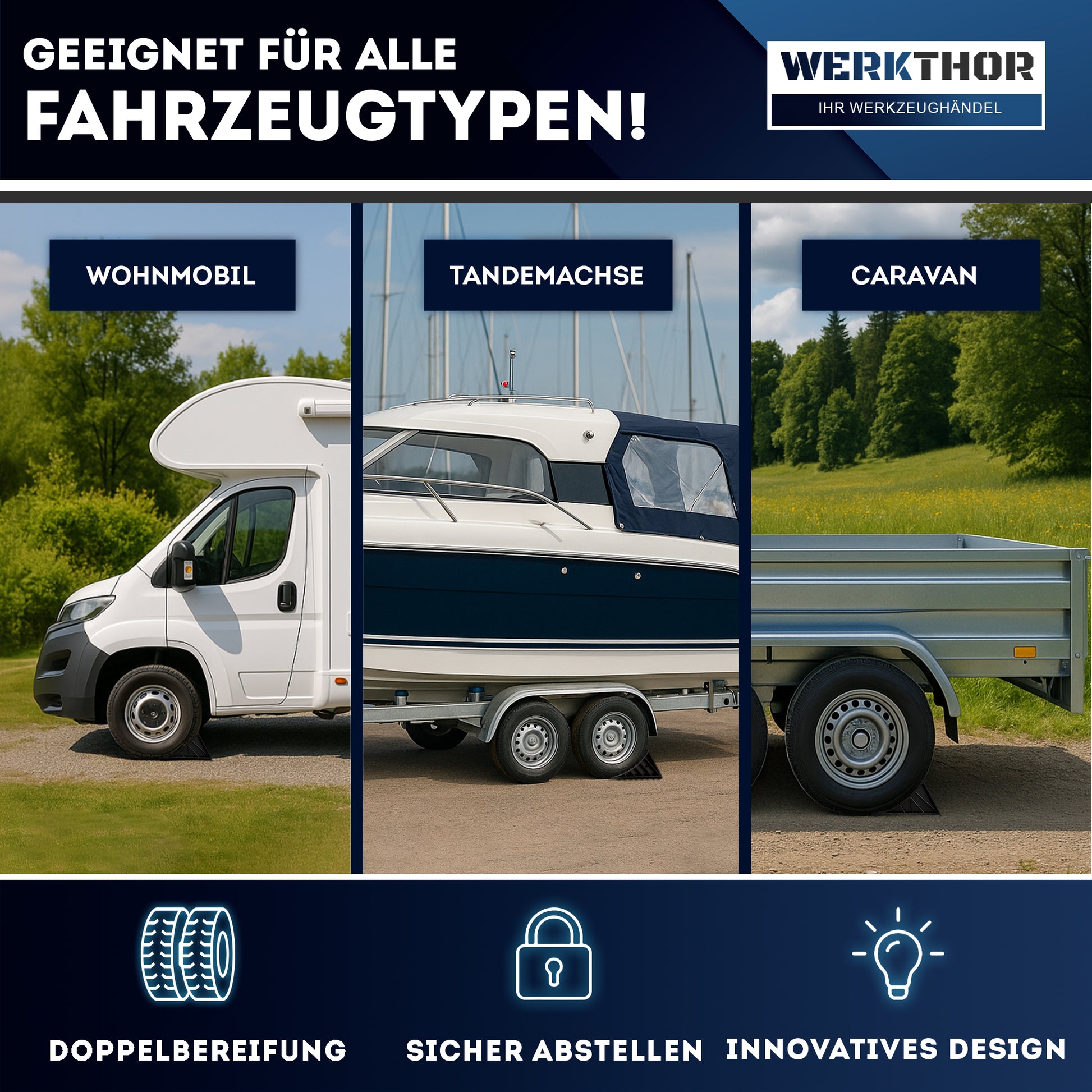 Oui, les cales de roue sont obligatoires pour les remorques en Allemagne afin d'éviter tout déplacement accidentel. Nos cales de roue WERKTHOR répondent à toutes les exigences légales et, grâce à leur construction robuste et au matériel de fixation fourni, offrent une sécurité maximale aux remorques et autres véhicules.