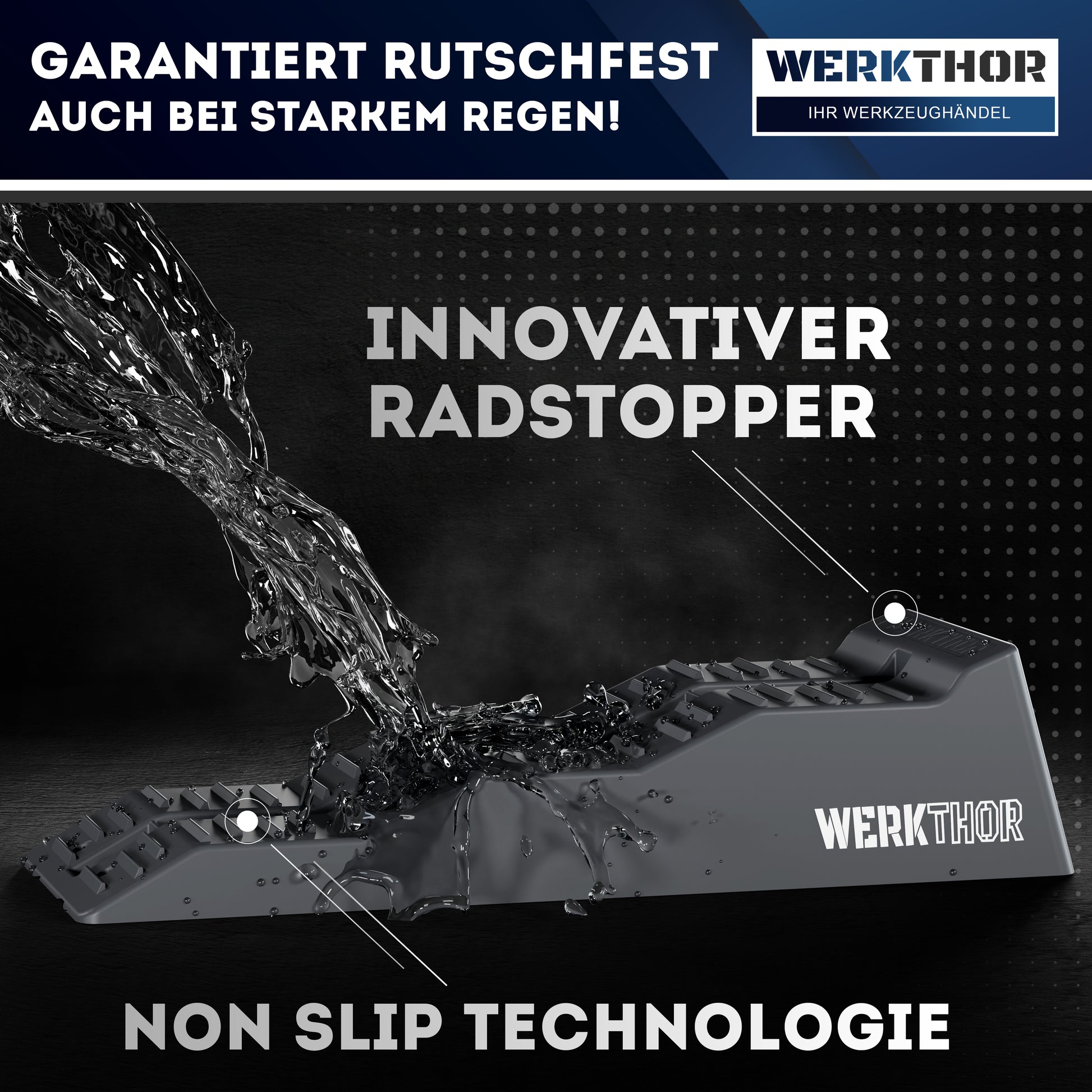 Con i cunei di sicurezza WERKTHOR, entrare in strada è semplicissimo: posiziona i cunei davanti alle ruote e procedi lentamente e con cautela fino a raggiungere l'altezza desiderata. Grazie all'ampia superficie antiscivolo, il tuo veicolo si fermerà in sicurezza. Puoi anche bloccarlo con il freno a mano e i cunei di sicurezza.