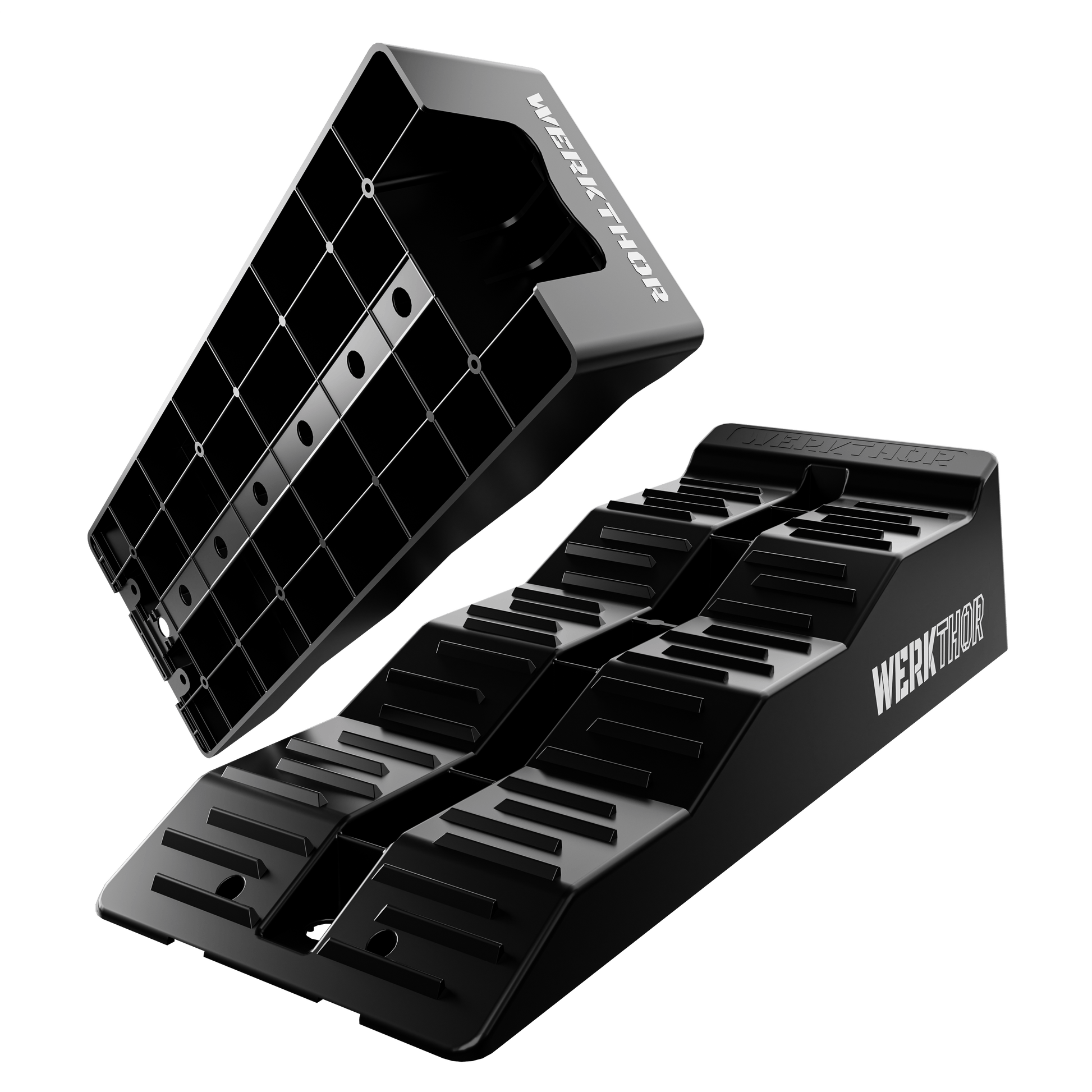 Con un'altezza fino a 12 cm e tre livelli di regolazione, le rampe WERKTHOR sono versatili e facili da usare. Queste dimensioni consentono un livellamento sicuro e pratico del veicolo, soprattutto su superfici irregolari.