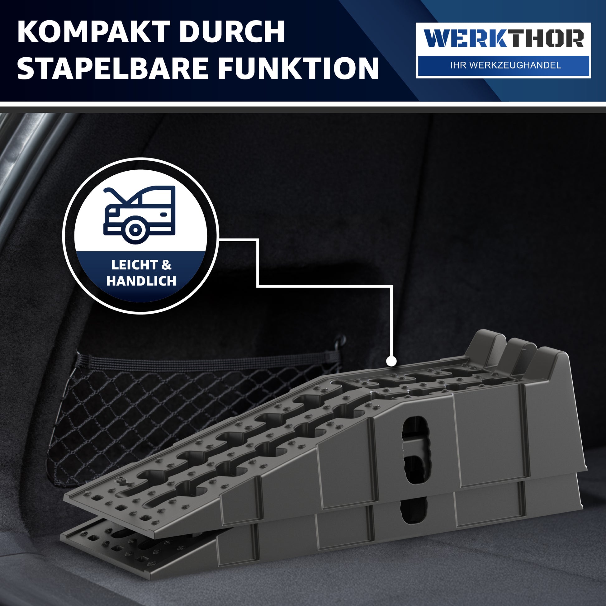 Le rampe di carico WERKTHOR sono ideali per auto, furgoni e piccoli veicoli commerciali. Con una capacità di carico fino a 2,5 tonnellate per rampa, sono perfettamente adatte alla maggior parte dei veicoli.