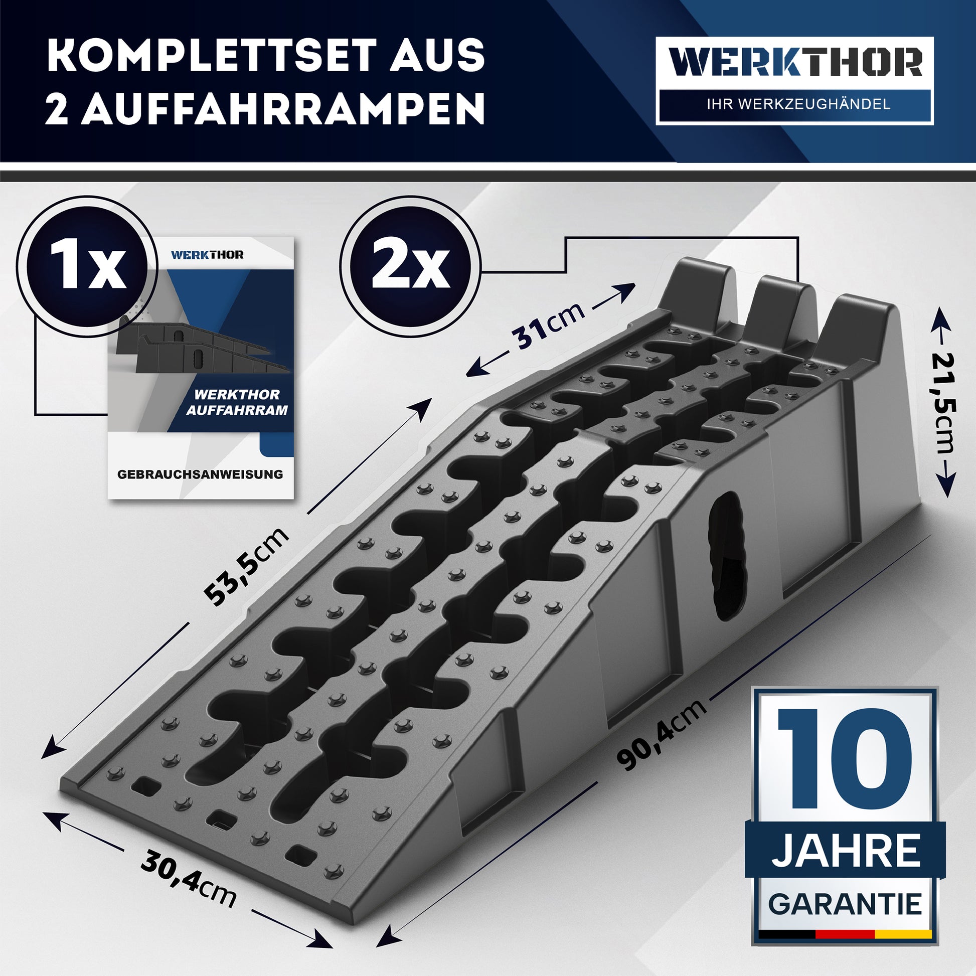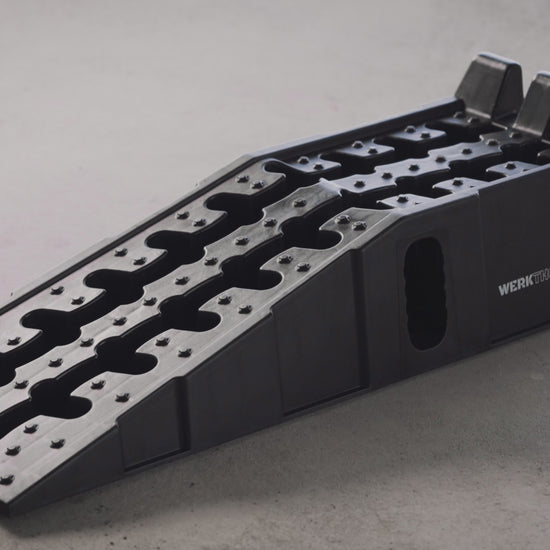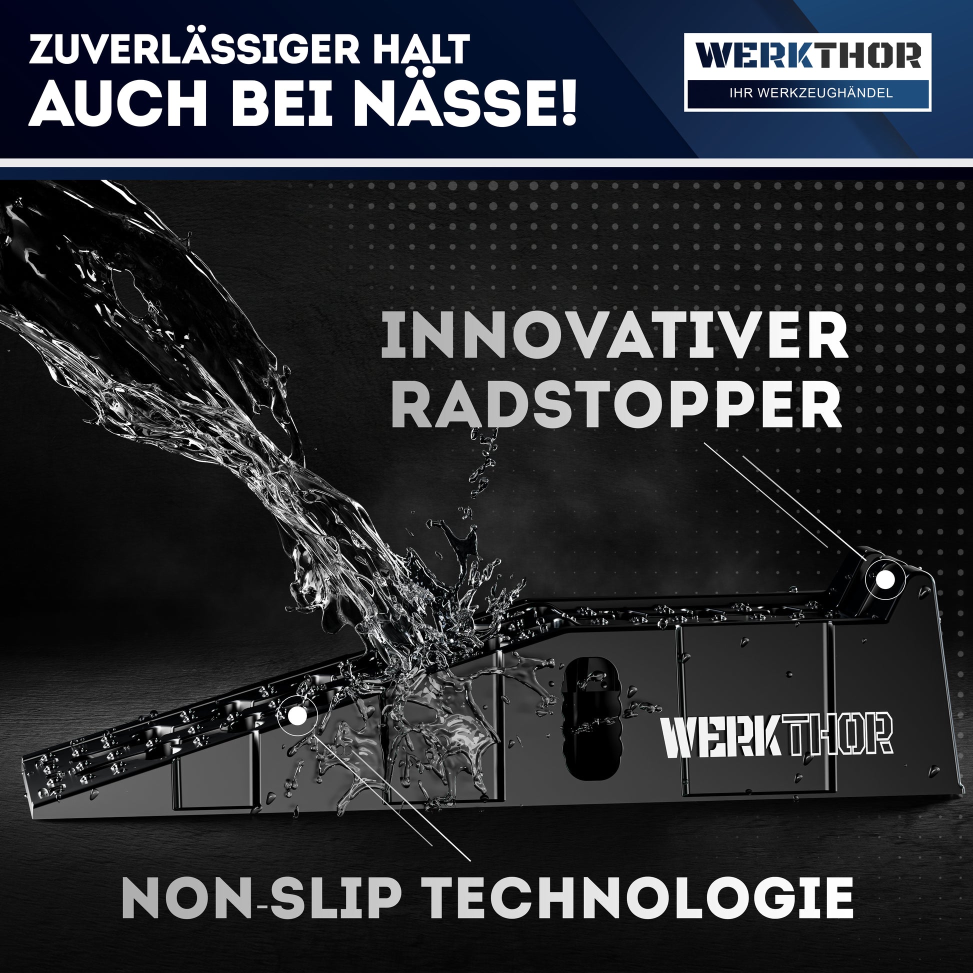 Unsere WERKTHOR-Auffahrrampen haben eine maximale Traglast von 2,5 Tonnen pro Rampe. Sie sind aus robustem Stahl gefertigt und bieten eine hohe Stabilität und Sicherheit.