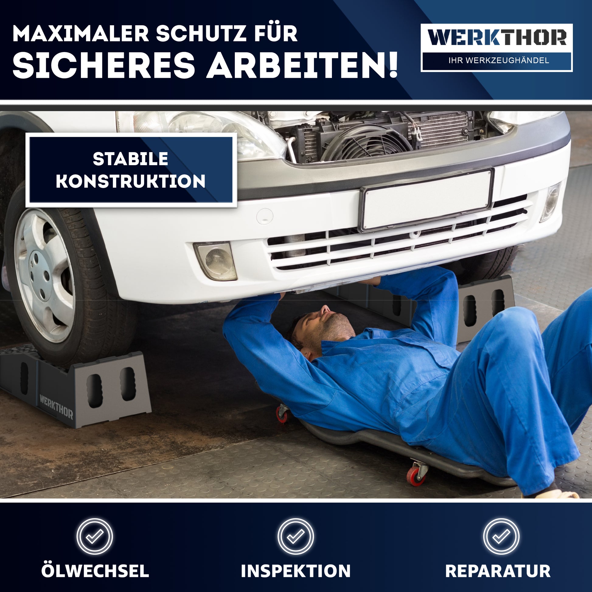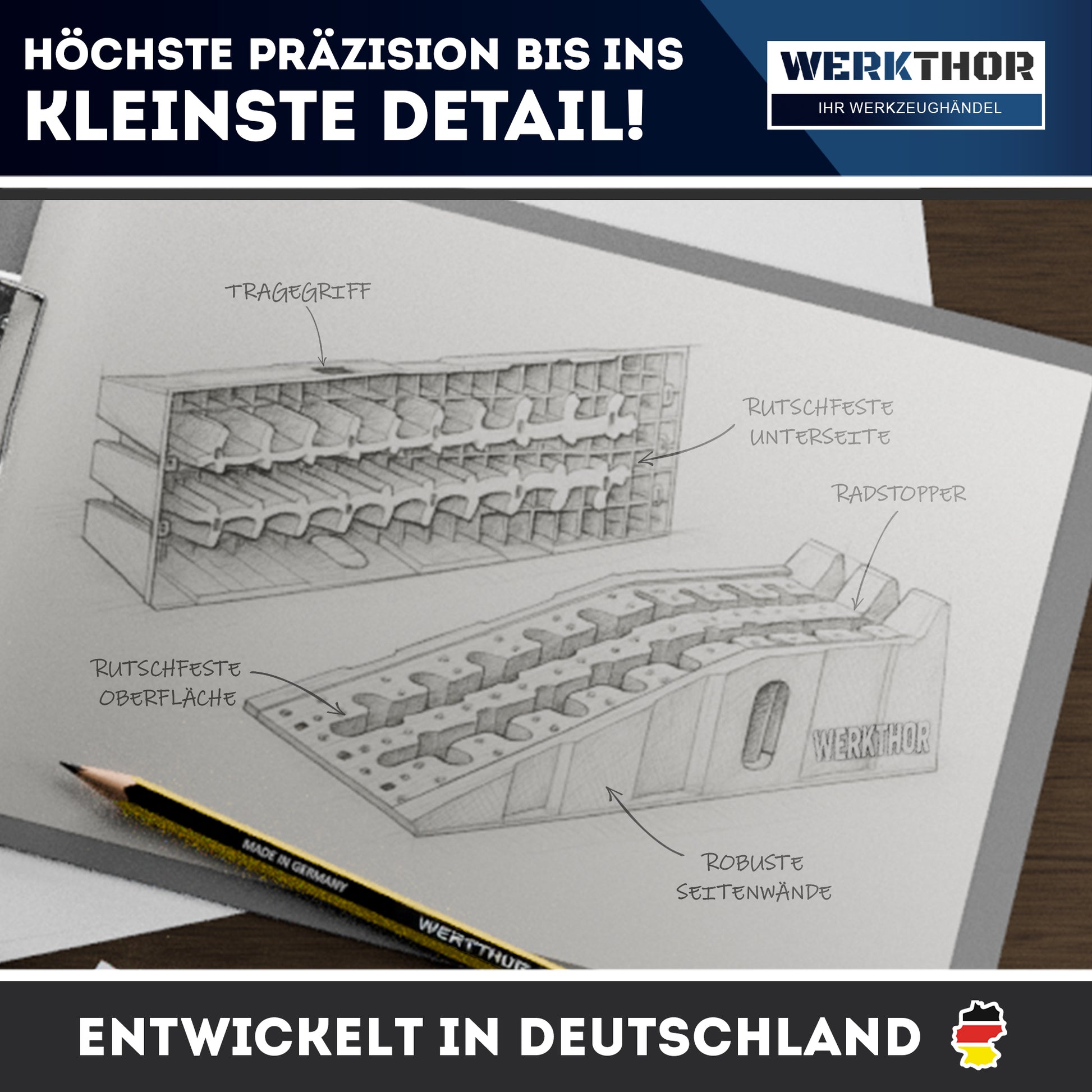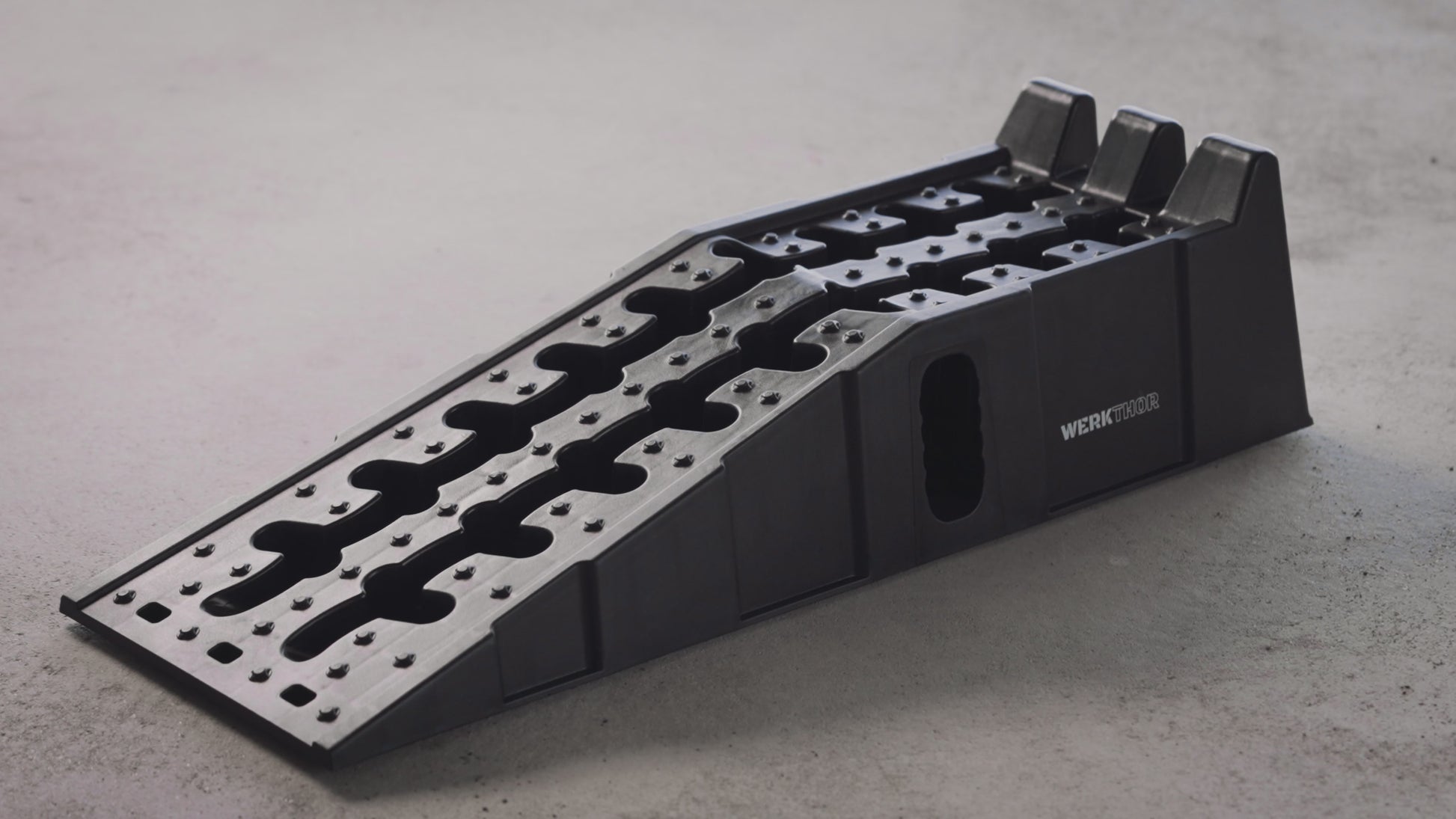 Die WERKTHOR-Auffahrrampen sind ideal für PKWs, Transporter und kleine Nutzfahrzeuge. Mit einer Traglast von bis zu 2,5 Tonnen pro Rampe sind sie perfekt für die meisten Fahrzeugtypen geeignet.